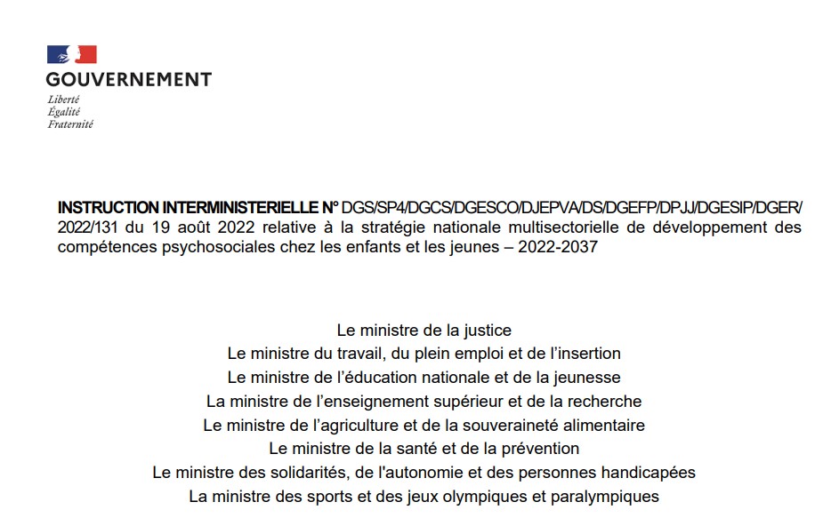 - INSTRUCTION INTERMINISTERIELLEN°DGS/SP4/DGCS/DGESCO/DJEPVA/DS/DGEFP/DPJJ/DGESIP/DGER/2022/131 du 19 août 2022 relative à la stratégie nationale multisectorielle de développement des compétences psychosociales chez les enfants et les jeunes – 2022-2037.- B.O. de la santé n°18 du 31 août 2022. URL : https://www.jeunes.gouv.fr/sites/default/files/2023-09/instruction-minist-rielle-pdf-3087.pdf
