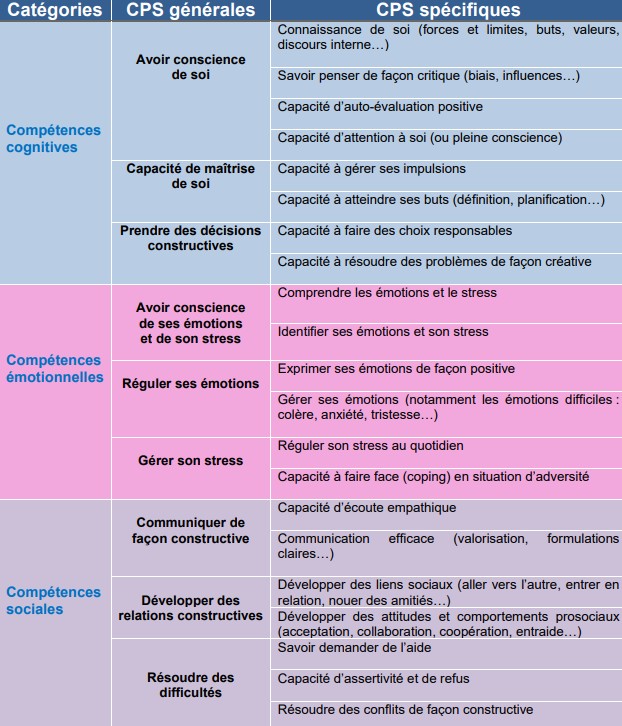 Par l’intermédiaire d’outils psychothérapeutiques d’auto-formation en e-learning prévus d’être introduits également dans les formations initiales, chaque intervenant auprès des parents et des « enfants dès le plus jeune âge », et plus particulièrement les enseignants ou intervenants périscolaires (Annexe 3), devront développer leurs propres CPS ou compétences de vie ( life skills provenant de l’US army) : confiance en soi, maîtrise de soi, l’identification de ses émotions, la gestion de son stress, le développement de relations constructives, la résolution de ses difficultés,… (Annexe 1).